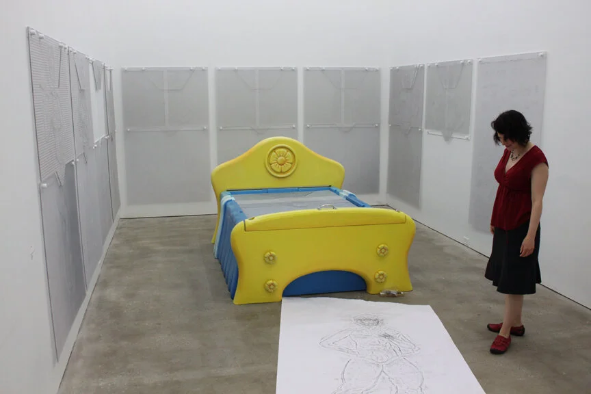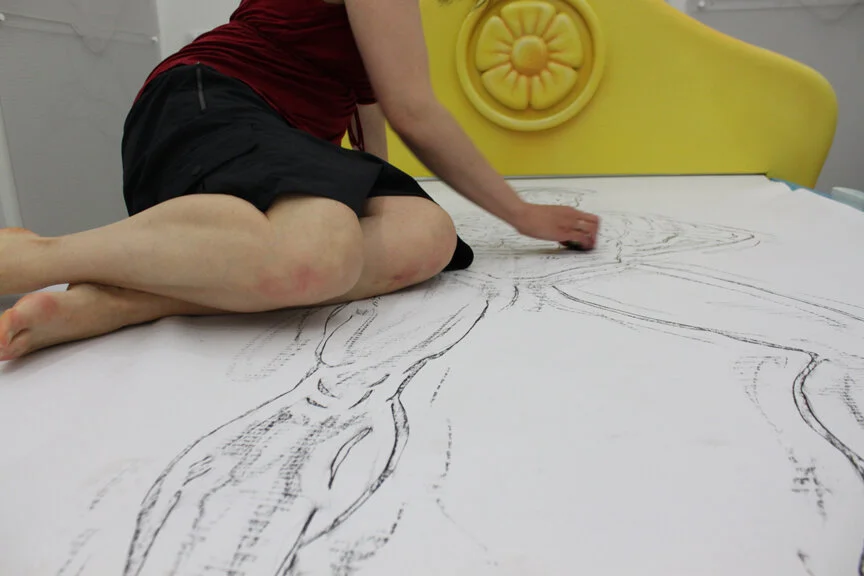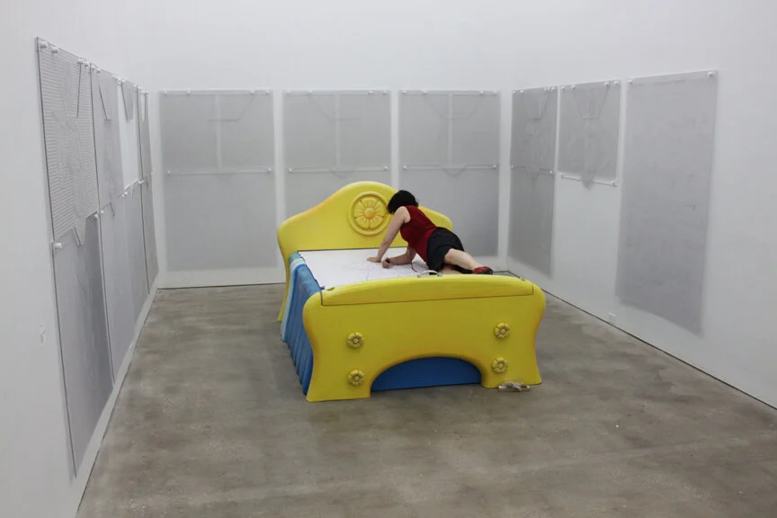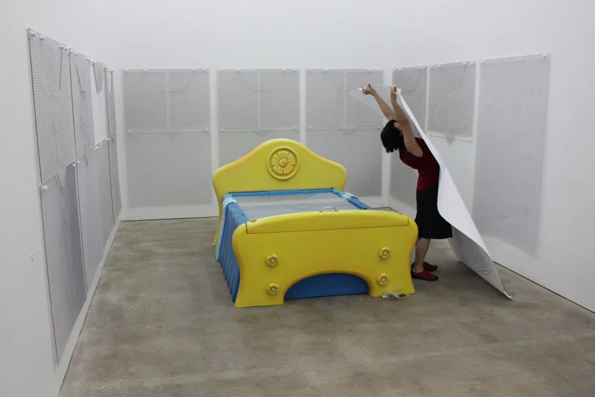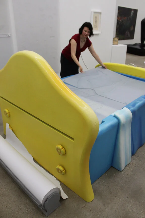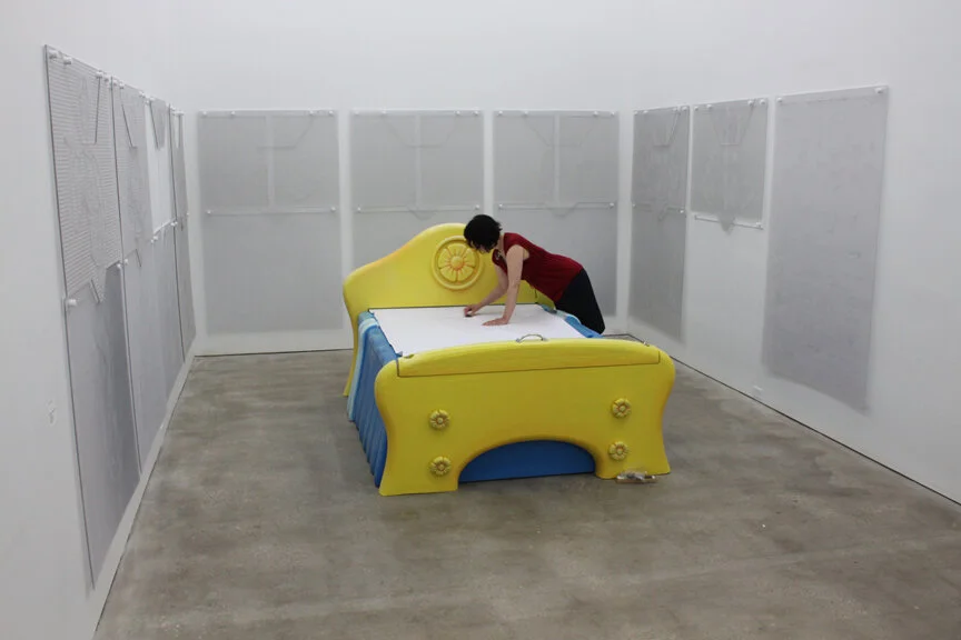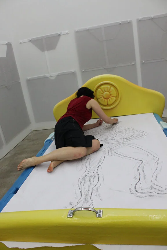 Mighty Men and Mistress Maker is a sculptural object, designed for gallery installation. Designed to look like a lifesized plastic toy bed, it comes with interchangeable plastic plates with mix and match body parts that can be placed on the bed. Visitors coming into the gallery are invited to select the body parts to design their ideal lover. Like the toy, the images will not be printed on the plates but sculpturally raised so that you can place a piece of paper over the plates and using a crayon or other soft drawing implement, rub over the surface to create an image of the person you've created. Mighty Men and Mistress Maker will beg to be performed. The performance of this work is two-fold – in order to create the ‘print’ of their ideal mate, the audience member must physically engage with the object, moving plates, placing paper down and rubbing the image into being. At the same time, the person creating the work becomes a spectacle for the other viewers, as they kneel beside, lay on top of, or straddle the lifesized bed and, therefore, their own hand-selected sexual fantasy creature, rubbing every line, curve, and bump on their body in order to flesh out the image. so that the act becomes a potentially scandalous spectacle for other gallery visitors and observers.
