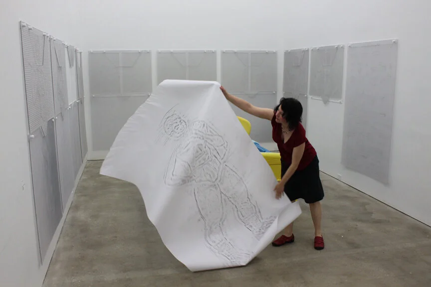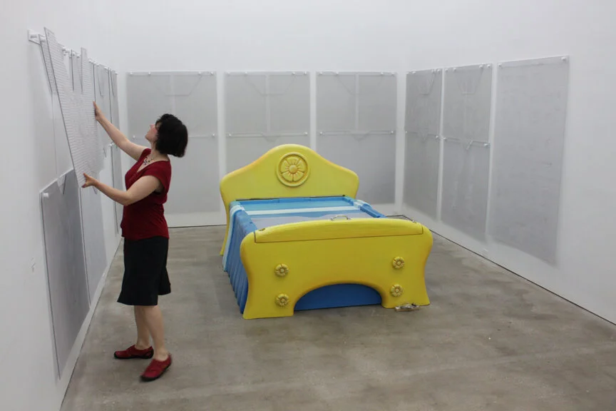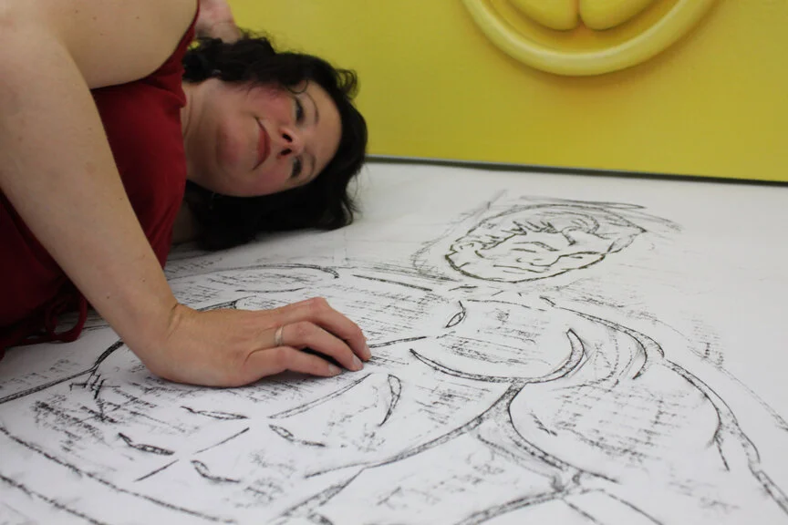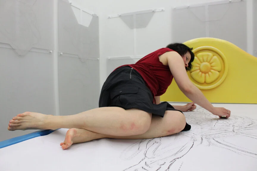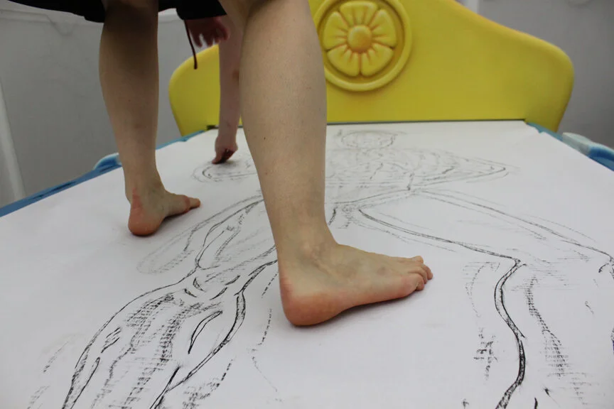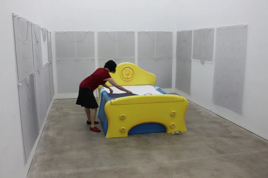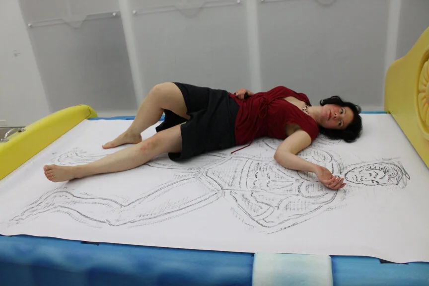 Mighty Men and Mistress Maker is a sculptural object, designed for gallery installation. Designed to look like a lifesized plastic toy bed, it comes with interchangeable plastic plates with mix and match body parts that can be placed on the bed. Visitors coming into the gallery are invited to select the body parts to design their ideal lover. Like the toy, the images will not be printed on the plates but sculpturally raised so that you can place a piece of paper over the plates and using a crayon or other soft drawing implement, rub over the surface to create an image of the person you've created. Mighty Men and Mistress Maker will beg to be performed. The performance of this work is two-fold – in order to create the ‘print’ of their ideal mate, the audience member must physically engage with the object, moving plates, placing paper down and rubbing the image into being. At the same time, the person creating the work becomes a spectacle for the other viewers, as they kneel beside, lay on top of, or straddle the lifesized bed and, therefore, their own hand-selected sexual fantasy creature, rubbing every line, curve, and bump on their body in order to flesh out the image. so that the act becomes a potentially scandalous spectacle for other gallery visitors and observers.