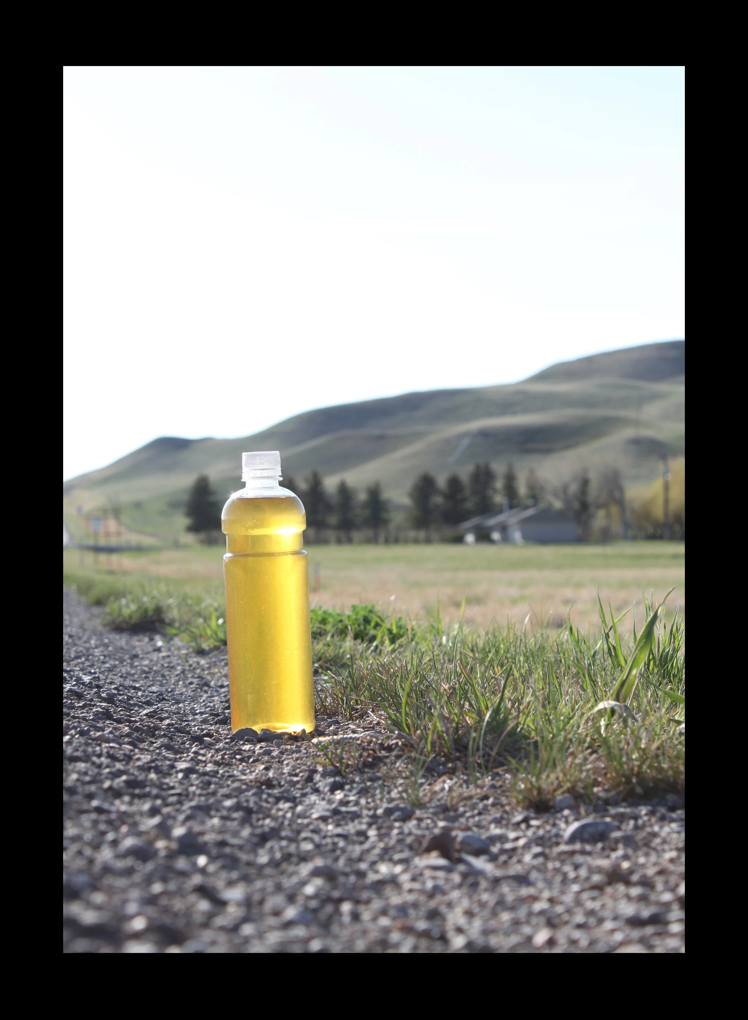 Taking the picture was as much of a production and a performance as making the trucker bombs. In order to photograph the bottle straight-on, sitting on the side of the road, I had to lay right down beside it, my camera sitting flat on the asphalt. Eventually, I stopped doing the project when I was almost always interrupted by concerned motorists stopping to see if I was alright (unless I was on small back roads). I can’t blame people for being concerned when they saw a woman laying on the side of the highway next to a stopped car, but after trying to explain to at least a dozen people that I was in fact fine, and having to tell them what I was doing (I made up a story about being a photojournalist doing a story about trucker bombs) and successfully fending off two state patrolmen, I found it at least a little bit helpful to have an accomplice/travel companion standing as nonchalantly as possible beside the car as a signal to passersby that everything was alright. Hazard lights and traffic cones did not seem to allay people’s concerns and seemed only to worry them more; I suppose that these are most often used by passenger vehicles as signs of some sort of distress.