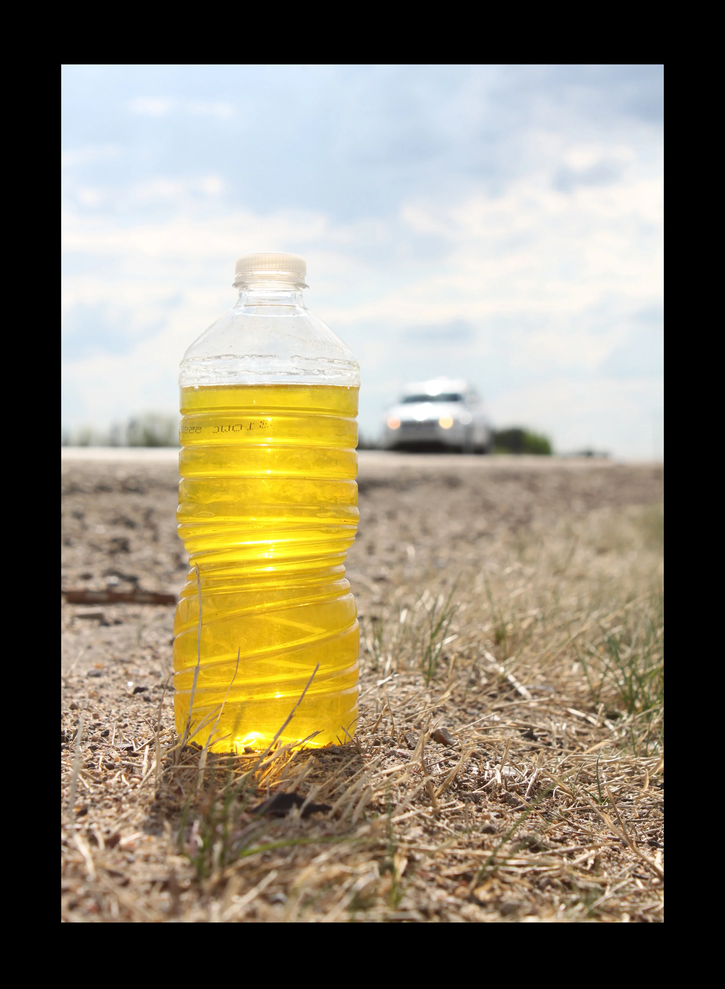 As a series of small actions, when driving on road trips (to and from Saskatoon, Calgary, Edmonton, Minnesota, etc.), I have started creating my own trucker bombs. Making sure I am carrying sealable, disposable drinking containers of water, I drive towards my destination until I need to urinate. I then do what I can to approximate the same series of actions that a man undertakes to create a trucker bomb. As a woman with very different physiology, however, it is a much more awkward and time-consuming process. I slow down and stop the car by the side of the road. Putting on my hazard lights, I get out of the car, go to the passenger side, open front and back passenger doors for shelter from the eyes of passing motorists, remove my underwear, place a funnel against my crotch, and squat into a bottle.